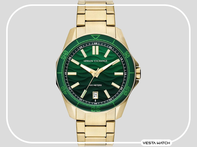 در صورتی که به دنبال خرید ساعت مچی آرمانی اکسچنج مردانه هستید، رفرنس AX1951 گزینهای عالی برای شما خواهد بود. دلایل مختلفی را میتوان برای این موضوع بیان کرد که مهمترین آنها شامل بدنه و بند استیل طلاییرنگ، صفحه و بزل سبز، عقربه و نشانگرهای شبنما و موتور کوارتز هستند. این محصول میتواند تا عمق 100 متر در برابر ورود آب به داخل قطعات خود، مقاومت داشته باشد. به همین خاطر استفاده از ساعت مچی مردانه آرمانی اکسچنج ARMANI EXCHANGE مدل AX1951 در هر شرایطی ممکن خواهد بود.