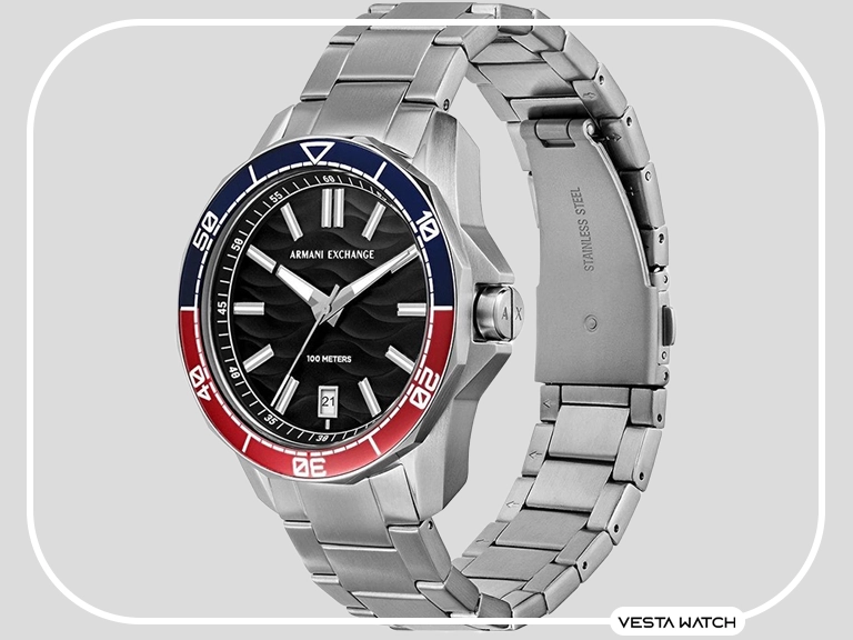 ساعت مردانه آرمانی اکسچنج AX1955 را میتوان بهعنوان یکی از خاصترین رفرنسهای این برند دانست. این محصول زیبا دارای یک بزل 2 رنگ که با آبی و قرمز مزین شده، است. همچنین صفحه مشکی آن بافت خاصی دارد که در کنار نشانگرها، جلوهای منحصربه فرد به وجود آوردهاند. قاب 44 میلیمتری استیل و بند 22 میلیمتر آن، به رنگ نقرهای هستند که ست کردن ساعت مچی مردانه آرمانی اکسچنج ARMANI EXCHAGE مدل AX1955 را با انواع استایل، راحتتر کردهاند.