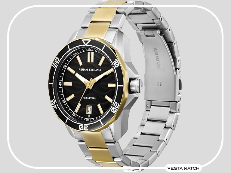 در صورتی که به مدلهای 2 رنگ علاقه دارید، پیشنهاد میکنیم حتما هنگام خرید ساعت آرمانی اکسچنج اصل مردانه رفرنس AX1956 را نیز موردبررسی قرار دهید. بند 22 میلیمتری این محصول با استفاده از استیل و 2 رنگ طلایی و نقرهای ساخته شده که جلوه بینظیری به مچ میبخشد. همچنین صفحه 44 میلیمتری آن مشکی بوده و یک بزل همرنگ نیز دور آن قرار گرفته که حس لوکس بودن را به استایل منتقل میکند. ساعت مچی مردانه آرمانی اکسچنج ARMANI EXCHAGE مدل AX1956 تا عمق 100 متر در برابر نفوذ آب مقاوم بوده و از موومنت کوارتز استفاده میکند.