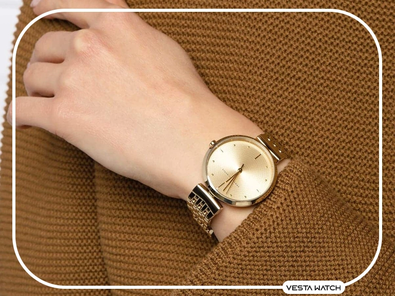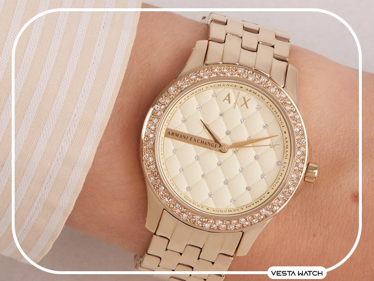 ساعت مچی زنانه آرمانی اکسچنج AX5902، محصولی است که نمیتوان بهراحتی از آن گذشت. این رفرنس زیبا از یک بدنه و بند تماماً استیل با بافت براق و رنگ طلایی تشکیل شده است. همچنین صفحه آن نیز به همین رنگ بوده و تکسچر خاصی روی آن مشاهده میشود که جذابیت بصری ساعت را بیشتر میکند. نشانگرها و عقربههای این محصول همانند استایل بانوان، ظریف و شیک هستند. مقاومت این ساعت در برابر نفوذ آب، تا عمق 30 متر خواهد بود. همچنین موتور کوارتز آن میتواند دقت بالا را طی سالهای طولانی حفظ کند.