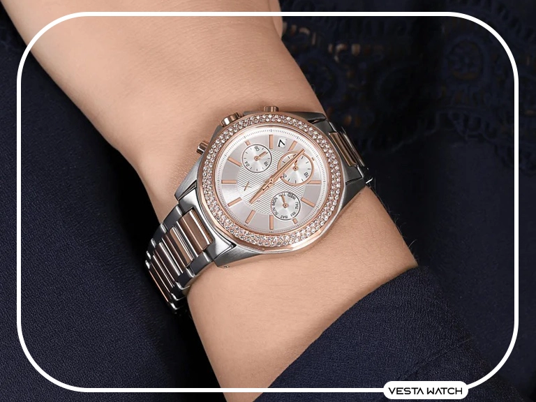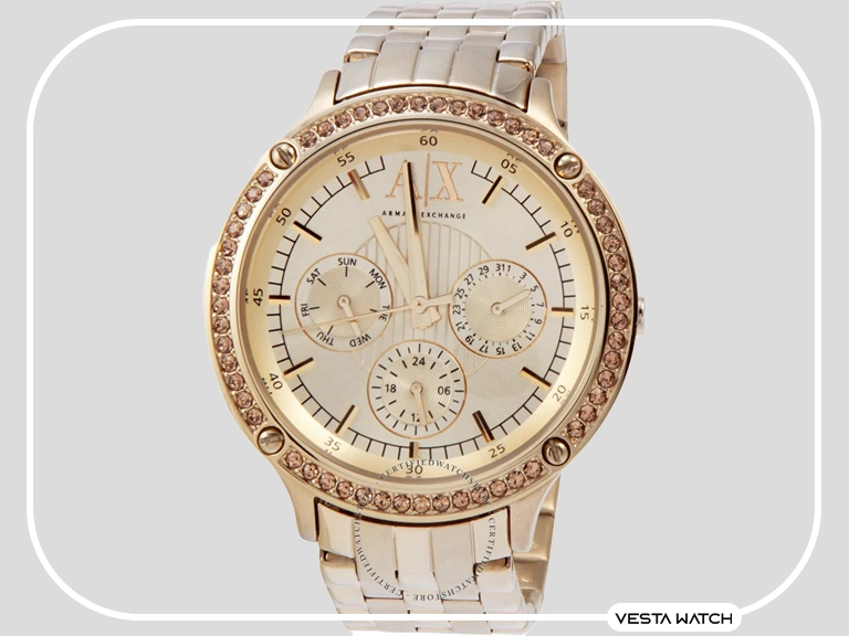 برای خرید ساعت آرمانی اکسچنج اصل زنانه، میتوانید سراغ مدل AX5653 بروید. جالب است بدانید که این محصول دارای قطر قاب 38 میلیمتری و ضخامت 9.4 میلیمتری است. بدنه و بند آن با استفاده از استیل ضد زنگ و روکش طلایی ساخته شدهاند. همچنین این ساعت میتواند تا عمق 50 متر در برابر نفوذ آب مقاومت داشته باشد. صفحه کرونوگراف آن نیز از 3 ساب دایال تشکیل شده که ظاهر ظریف این محصول را حرفهایتر میکند. قیمت ساعت مچی آرمانی اکسچنج AX5653 در مقایسه با برندهای دیگر، مقرونبهصرفهتر بوده و همین موضوع موجب افزایش چندین برابر ارزش خرید آن شده است.