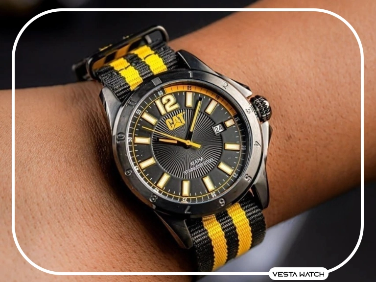 برند CATERPILLAR که ریشه در مهندسی و تجهیزات صنعتی دارد، مفهوم دوام و عملکرد را به دنیای ساعتسازی منتقل کرده است. در استایل طبیعتگردی، این اکسسوری باید در برابر فشار، رطوبت و ضربه مقاومت داشته باشد؛ ویژگیهایی که در ساعت بند برزنتی یا ساعت بند ناتو این برند بهخوبی دیده میشود. مدلهای مقاوم کاترپیلار، بهویژه برای ساعت طبیعتگردی، ترکیبی از استحکام و طراحی مدرن ارائه میدهند. رنگهای زرد صنعتی، مشکی و سبز زیتونی در بندهای پارچهای، حس ماجراجویی را تقویت میکنند. به همین دلیل، محصولات برند کاترپیلار مانند CAT YW.141.67.137 و CAT YW.161.64.137 بهعنوان بهترین ساعت بند ناتو مردانه برای طبیعتگردی شناخته میشود؛ محصولی که عملکرد فنی و استایل ماجراجویانه را در یک قاب واحد جمع کرده است. برای انتخاب از میان مدلهای کاترپیلار، باید به مقاومت در برابر ضربه، نفوذ آب و میزان راحتی آن توجه داشته باشید.