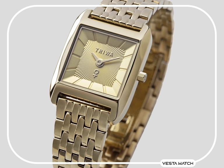 ساعت مچی زنانه تریوا TRIWA مدل POW101-BS121313 از کالکشن Power با طراحی مستطیلی باریک و بند استیل طلایی، ظاهری کلاسیک و لوکس دارد. صفحه طلایی ساده ساعت در کنار موتور کوارتز ژاپنی دقیق آن، ترکیبی از زیبایی و عملکرد را ارائه میدهد. وجود شیشه معدنی مقاوم و قابلیت مقاومت در برابر آب تا عمق ۵۰ متر نیز از ویژگیهای برجسته این مدل است. این ساعت انتخابی عالی برای بانوانی است که به دنبال استایلی ظریف اما چشمگیر هستند.